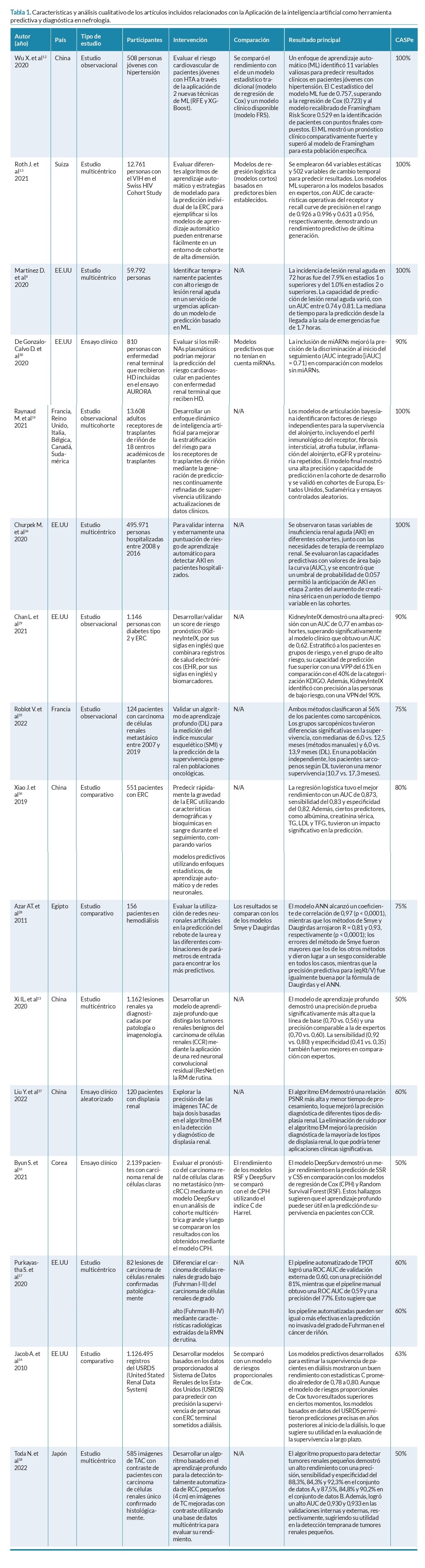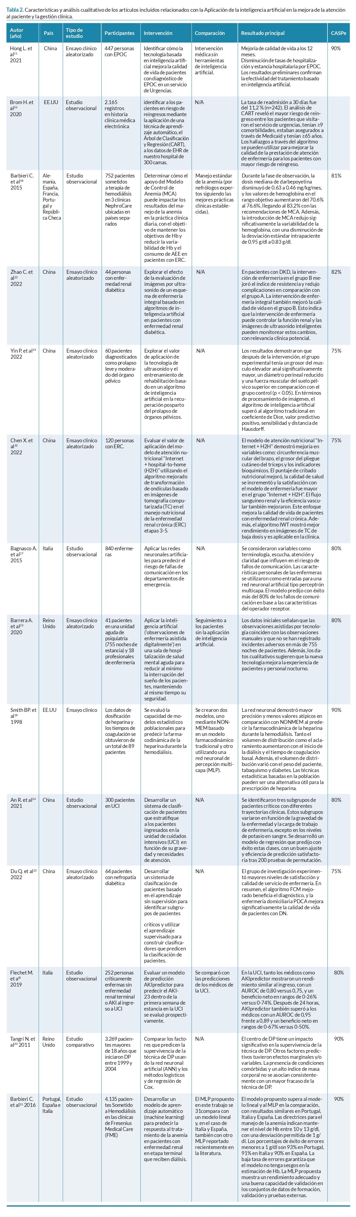 RESUMEN Introducción: La introducción de la inteligencia artificial, en el área de la nefrología, proporciona una nueva perspectiva para analizar datos en tiempo real mediados por tecnología. Objetivos: Determinar las aplicaciones de la inteligencia artificial en la práctica de la enfermería nefrológica y caracterizar herramientas predictivas, diagnósticas y de gestión clínica dirigidas a pacientes con enfermedad renal. Metodología: Se realizó una revisión integrativa de literatura siguiendo la declaración PRISMA. Se buscaron artículos originales sin límite temporal en MEDLINE, EBSCO, Cochrane y LILACS, usando combinaciones de términos relacionados con inteligencia artificial, enfermería y nefrología. Se incluyeron estudios observacionales, experimentales y ensayos clínicos en población adulta, publicados en inglés, español o portugués. Se excluyeron desarrollos robóticos, pacientes gineco-obstétricas y revisiones previas. Dos revisores extrajeron de forma independiente datos sobre diseño, muestra, intervenciones, comparadores y resultados principales, aplicando guías CASPe para evaluar la calidad metodológica. Resultados: De 279 registros iniciales, 30 estudios cumplieron los criterios de inclusión. Se agruparon en dos categorías: 16 trabajos en herramientas predictivas y diagnósticas, y 14 en mejora de atención y gestión clínica (sistemas de clasificación de pacientes, alertas tempranas, optimización de diálisis y prevención de readmisiones). La mayoría mostró superioridad de modelos de aprendizaje automático y deep learning frente a enfoques tradicionales. Conclusiones: La inteligencia artificial aplicada en enfermería nefrológica demuestra un rendimiento prometedor en predicción y diagnóstico, así como en la optimización de procesos asistenciales. Se requieren estudios de implementación clínica y evaluaciones costo-efectivas para consolidar su integración en la práctica diaria y maximizar sus beneficios. Palabras clave: inteligencia artificial; aprendizaje automático; enfermedades renales; enfermería nefrológica; sistemas de apoyo a la decisión clínica computarizados; revisión de literatura. ABSTRACT Applications of Artificial Intelligence in Nephrology Nursing: An Integrative Review of Predictive and Clinical Management Tools Introduction: The introduction of artificial intelligence (AI) into the field of nephrology offers a new perspective for analysing technology-mediated real-time data. Objectives: To determine the applications of artificial intelligence in nephrology nursing practice and to characterise predictive, diagnostic, and clinical management tools aimed at patients with kidney disease. Methodology: AWe conducted an integrative literature review in accordance with the PRISMA statement. Original articles with no time restriction were searched in MEDLINE, EBSCO, Cochrane, and LILACS using combinations of terms related to artificial intelligence, nursing, and nephrology. Observational studies, experimental studies, and clinical trials in adult populations published in English, Spanish, or Portuguese were included. Excluded were robotic developments, gynaecological–obstetric patients, and previous reviews. Two reviewers independently extracted data on study design, sample, interventions, comparators, and main outcomes, applying CASPe guidelines to assess methodological quality. Results: From 279 initial records, 30 studies met the inclusion criteria. They were grouped into 2 categories: 16 studies on predictive and diagnostic tools, and 14 on improved care and clinical management (patient classification systems, early warning systems, dialysis optimisation, and readmission prevention). Most demonstrated the superiority of machine learning and deep learning models compared with traditional approaches. Conclusions: AI applied to nephrology nursing shows promising performance in prediction and diagnosis, as well as in the optimisation of care processes. Clinical implementation studies and cost-effectiveness evaluations are needed to consolidate its integration into daily practice and maximise its benefits. Keywords: artificial intelligence; machine learning; kidney diseases; nephrology nursing; computerised clinical decision support systems; literature review. INTRODUCCIÓN La inteligencia artificial (IA) se refiere a la capacidad que poseen algoritmos codificados en medios tecnológicos para aprender con el fin de realizar tareas automatizadas que no requieren la interacción humana en cada etapa del proceso1. La IA es una rama de la ingeniería y la informática que se dedica al diseño y programación de herramientas que imitan la sinapsis neuronal con un código binario de comandos para acercarse a la capacidad humana de aprender, razonar y autocorregirse2. Actualmente, la búsqueda de herramientas y procesos que permitan facilitar y mejorar la calidad de vida ha penetrado todos los campos, incluyendo las ciencias de la salud, el cual continúa en transformación3. Dentro de las ventajas que ofrece la aplicación de IA se encuentran la capacidad de aumentar las competencias de los prestadores de atención en salud incluyendo el apoyo en diagnóstico, la optimización de los planes de tratamiento a través de la individualización de cada persona o apoyando los procesos financieros dentro del marco de los sistemas de salud. Esto permite mejorar los servicios ofertados a la población1,2. La enfermedad renal crónica (ERC) es la sexta causa de muerte a nivel mundial. Afecta cerca del 10% de la población, se estima que 850 millones de personas en el mundo padecen de ERC y es responsable de al menos 2,4 millones de muertes al año, mientras que la lesión renal aguda, precursora de la ERC, afecta a más de 13 millones de personas en el mundo4. En Latinoamérica la incidencia promedio es de 162 pacientes por millón de habitantes5. América Latina tiene la tasa de mortalidad más alta de ERC en el mundo y es la segund