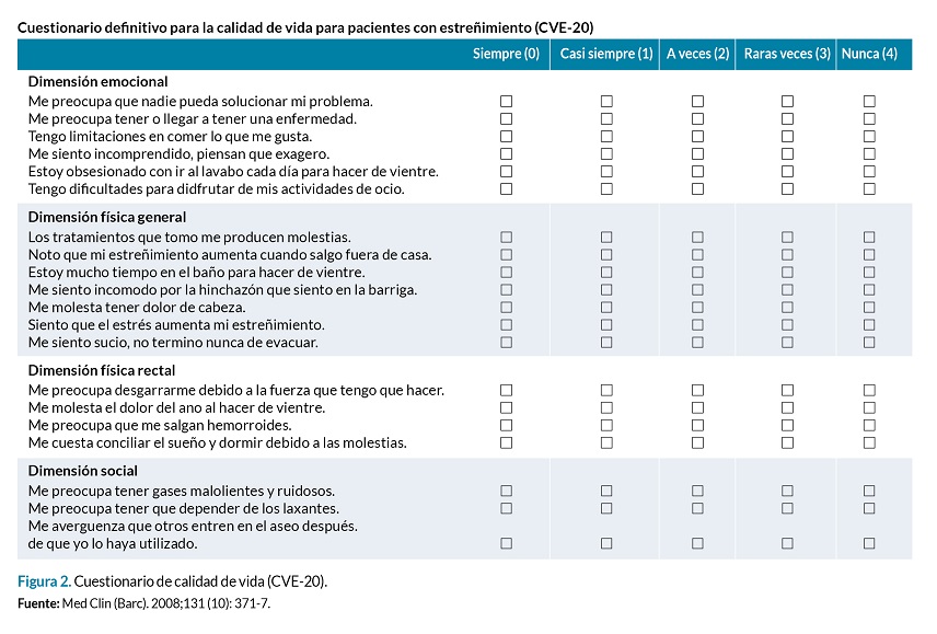 - Cuestionario diseñado ad hoc para evaluar el estreñimiento subjetivo, que recogía la definición de EF y a continuación se les preguntaba si consideraban que dicha definición se correspondía con su situación actual. Al ser de elaboración propia y no estar validado, se ha desarrollado siguiendo una revisión exhaustiva de la literatura existente.