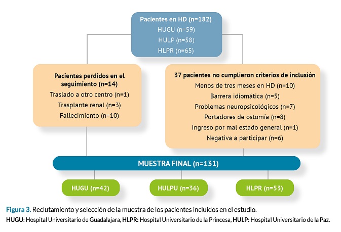 Procedimiento estadístico. Los resultados obtenidos fueron procesados por el programa Excel Microsoft 2019 y SPSS 28.0 y expresados a través de valores absolutos y porcentajes para las variables categóricas; medias-desviación estándar para las variables cuantitativas con distribución normal; utilizando tablas para su representación. La comparación entre variables cuantitativas con distribución normal y con varianzas similares en los grupos a comparar, se realizó a través de la t de Student, concretando una significación estadística para una p<0,05 con un intervalo de confianza del 95%. Para la comparación de porcentajes se utilizó el test de Chi-Cuadrado. Aspectos éticos y legales. El presente trabajo se desarrolló respetando en todo momento los principios éticos recogidos en la Ley 14/2007, de 3 de julio, de Investigación Biomédica y la Declaración de Helsinki (1964) y fue aprobado por el Comité de Ética de la Investigación del Medicamento (CEIm) del HLPR (5446) a fecha 22-01-2024, con la conformidad del resto de los hospitales. Todos los pacientes fueron informados del objetivo del estudio y firmaron el CI, que junto con las encuestas recogidas se escanearon y almacenaron para su custodia en una carpeta cifrada de seguridad (identificados con un número asignado) por el investigador principal del HLPR, sometidos a las garantías del Reglamento (UE) 2016/679 del Parlamento Europeo y del Consejo, de 27 abril del 2016 (General de Protección de Datos, RGPD), referidos a la protección de las personas físicas en lo respectivo al tratamiento de datos personales y a la libre circulación de estos. Por otro lado, se guardó total confidencialidad de los datos de los participantes según la Ley Orgánica 3/2018, de 5 diciembre, de Protección de Datos Personales y garantía de los derechos digitales, y actualmente modificada por la Ley 11/2023, de 8 mayo. RESULTADOS Un total de 182 personas se encontraban en tratamiento activo en HD en los tres hospitales; tras aplicar los criterios definidos previamente se excluyeron 51 (ver figura 3), por lo que la muestra definitiva quedó constituida por 131 pacientes, con una edad media de 69,64±14,22 años, siendo un 59,5% (n=78) hombres. | ||