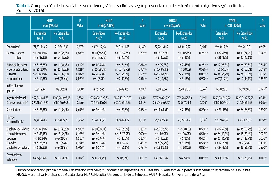 RESUMEN Introducción: En personas en hemodiálisis, el estreñimiento supone una de las afecciones gastrointestinales más frecuentes, vinculada a factores como la comorbilidad, tratamiento farmacológico, edad avanzada y restricciones hídricas-dietéticas; pudiendo afectar la calidad de vida. Objetivo: Determinar el impacto del estreñimiento en la calidad de vida de las personas en hemodiálisis, analizar la prevalencia de estreñimiento objetivo y subjetivo y los posibles factores relacionados. Material y Método: Estudio observacional transversal multicéntrico desarrollado en la Unidad de hemodiálisis de tres hospitales. Se aplicaron Criterios Roma IV para evaluar el estreñimiento objetivo; para el subjetivo se utilizó un cuestionario diseñado ad hoc, y el cuestionario CVE-20 para evaluar la calidad de vida. Resultados: Muestra de 131 pacientes; un 45,8% presentó estreñimiento objetivo y un 71,7% subjetivo. Los pacientes con estreñimiento, un 65% eran hombres, edad media de 69,63±15,63 años y 52,11±46,91 meses en hemodiálisis; un 91,7% eran hipertensos, 56,7% diabéticos, 28,3% presentaron patología digestiva y 11,7% hipotiroidismo. Diuresis media 358,33±574,61 ml vs ingesta hídrica 1.253,33±819,92 ml. Tratamiento farmacológico: 20% tomaba opioides, 65% quelantes del fósforo, 45% del potasio, 41,7% tenían laxantes pautados y 43,3% hierro endovenoso. La calidad de vida fue inferior en los pacientes estreñidos (58,55±16,25 vs 64,63±15,56 puntos, p=0,026), existiendo diferencias en la afectación de las dimensiones entre hospitales. Conclusiones: En personas en hemodiálisis, existe una alta prevalencia de estreñimiento objetivo y subjetivo con un impacto negativo en su calidad de vida. Se propone intervenir con educación sanitaria sobre la prevención y manejo del estreñimiento, para mejorar su calidad de vida. Palabras clave: calidad de vida; enfermedad renal crónica; estreñimiento; estudio multicéntrico; hemodiálisis. ABSTRACT Impact of constipation on the quality of life of people on haemodialysis. Multicentre study Introduction: In people on haemodialysis, constipation is one of the most common gastrointestinal complaints, linked to factors such as comorbidity, pharmacological treatment, advanced age and water-dietary restrictions, and may affect quality of life. Objetive: To determine the impact of constipation on the quality of life of people on haemodialysis, to analyse the prevalence of objective and subjective constipation and possible related factors. Material and Method: This multicentre cross-sectional observational study was carried out in the haemodialysis units of three hospitals. Rome IV criteria were applied to assess objective constipation, an ad hoc questionnaire was used to determine subjective constipation, and the CVE-20 questionnaire was used to evaluate quality of life. Results: In the sample of 131 patients, 45.8% presented objective constipation and 71.7% subjective constipation. The constipated patients were 65% male, with mean age 69.63±15.63 years and 52.11±46.91 months on haemodialysis; 91.7% were hypertensive, 56.7% diabetic, 28.3% had digestive pathology, and 11.7% hypothyroidism. Mean diuresis 358.33±574.61 ml vs. water intake 1,253.33±819.92ml. Pharmacological treatment: 20% were taking opioids, 65% phosphorus chelators, 45% potassium chelators, 41.7% had prescribed laxatives, and 43.3% intravenous iron. Quality of life was lower in constipated patients (58.55±16.25 vs. 64.63±15.56 points, p=0.026), and there were differences between hospitals in the dimensions affected. Conclusions: Objective and subjective constipation is highly prevalent in people on haemodialysis and negatively impacts their quality of life. To improve this, health education on the prevention and management of constipation is proposed. Keywords: quality of life; chronic kidney disease; release; multicentre study; haemodialysis. INTRODUCCIÓN La World Gastroenterology Organization (WGO) define el estreñimiento funcional (EF) como un trastorno gastrointestinal caracterizado por la dificultad persistente para evacuar las heces, la sensación de defecación incompleta y/o defecación infrecuente en ausencia de patología subyacente y consta tanto de componentes objetivos como subjetivos que dependen de la percepción del paciente1. Asimismo, la North American Nursing Association (NANDA) recoge el estreñimiento como un diagnóstico enfermero con el código [00011]2. A nivel mundial, se estima que la prevalencia de estreñimiento en población general es de un 14-16%3, en Europa de un 17,1%4 y España alcanza cifras entorno al 12-20%, considerándose el segundo país de Europa con mayores cifras de estreñimiento objetivo, según la Fundación Española del Aparato Digestivo (FEAD)5. Además, hay que destacar que la prevalencia de estreñimiento subjetivo en población general española se estima en torno a un 18,4%6. En personas con enfermedad renal crónica (ERC), el estreñimiento se ha descrito como una de las afecciones gastrointestinales más frecuentes. En aquellas personas que reciben terapia renal sustitutiva (TRS) como la diálisis peritoneal (DP) y la hemodiálisis (HD), la prevalencia varía sustancialmente en la literatura consultada, oscilando entre el 1,6-71,7% en HD y 14,2-90,3% en DP7,8; los estudios más recientes reflejan que la prevalencia de estreñimiento es mayor en personas en HD9,10 siendo 3,1 veces mayor que en DP11. Este trastorno gastrointestinal se encuentra vinculado a factores como la elevada comorbilidad, a la farmacología (suplementos de hierro, quelantes de fósforo y potasio), la edad avanzada, el sedentarismo y las restricciones hídricas y dietéticas que implica la ERC7,8. En la actualidad, varios estudios llevados a cabo en personas en HD han señalado que el estreñimiento tiene un profundo impacto tanto en la persona como en su entorno, comprometiendo su calidad de vida (CV)4,7,8,12,13 y se relaciona con una