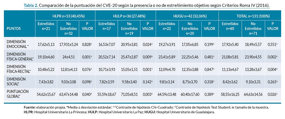 En relación con el estreñimiento subjetivo, un total de 63 pacientes manifestaron presentar síntomas de estreñimiento, un 71,6% de los pacientes (n= 43) pertenecían al grupo con presencia de EF vs 28,2% (n=20) del grupo sin EF. Según hospitales, en el HLPR, del total de pacientes con EF, un 71,4% (n=15) manifestó estreñimiento subjetivo vs 31,3% (n=10) que indicaron estreñimiento subjetivo entre el grupo de pacientes sin EF. En el HULP un 64,7% (n=11) vs 5,3% (n=1) y el HUGU un 77,3% (n=17) vs 54% (n=9). Se encontró que el porcentaje de pacientes con estreñimiento subjetivo fue mayor en el grupo de pacientes con EF que en aquellos que no presentaban EF, alcanzándose la significación estadística tanto en la muestra total (p=0,001), como en cada hospital: HLPR (p=0,004), HULP (p=0,001), HUGU (p=0,031). Respecto a los resultados obtenidos de CV mediante el cuestionario CVE-20, se objetiva una puntuación inferior en los pacientes que presentaban EF (58,55±16,25 puntos) frente aquellos que no lo presentaban (64,63±14,56 puntos); con diferencias significativas en la puntuación global (p=0,026), dimensiones física-general (p=0,002) y física-rectal (p=0,004). Al analizar la CV de forma independiente por hospital se obtuvieron resultados dispares: el HLPR presentó significación estadística en la dimensión física-general (p=0,001) y puntuación global (p=0,040); el HULP en la dimensión emocional (p=0,024), física-general (p=0,009), física-rectal (p=0,001) y puntuación global (p=0,003); y el HUGU no presentó significación estadística negativa en ninguna dimensión (ver tabla 2). | ||