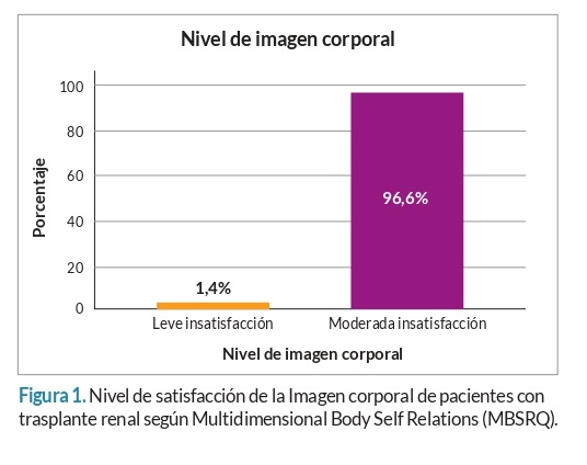 RESUMEN Introducción: El trasplante renal constituye la opción terapéutica más favorable para pacientes con enfermedad renal crónica terminal, se relaciona con menor mortalidad y mayor supervivencia comparado con otras opciones; sin embargo, los receptores enfrentan dificultades para adaptarse al órgano donado, percibiéndolo como un cuerpo extraño, lo que distorsiona su imagen corporal y propicia comportamientos negativos que afectan su calidad de vida. Objetivos: Determinar la relación entre la imagen corporal y la calidad de vida en pacientes con trasplante renal funcionante. Material y Método: Estudio observacional descriptivo de corte transversal. Se obtuvo una muestra no probabilística e intencional de receptores de trasplante renal que consintieron en participar en el estudio y cumplían los criterios de selección. Se utilizaron el cuestionario multidimensional Body Self Relations Questionnaire para la variable imagen corporal y el cuestionario SF-36 para la variable calidad de vida. Resultados: Participaron 71 pacientes, el 98,6% refirió tener moderada insatisfacción respecto a su imagen corporal. Referente a la calidad de vida, la mayoría presenta nivel muy alto con 57,7% seguido de nivel alto con 38,1%. Se encontró una relación significativa entre menor afectación de la imagen corporal y mayor calidad de vida en los pacientes estudiados (Rho de Spearman =-0,375 y p-valor de <0,001). Conclusiones: En los pacientes con trasplante renal funcionante, al menos en la muestra estudiada, una menor afectación de la imagen corporal está relacionada con mejor calidad de vida. Palabras clave: imagen corporal; calidad de vida; trasplante renal; enfermedad renal crónica. ABSTRACT Analysis of the relationship between body image and quality of life in patients with functioning renal transplants Introduction: Renal transplantation is the most favourable therapeutic option for patients with end-stage chronic kidney disease, being associated with lower mortality and greater survival vs other alternatives. However, recipients face difficulties in adapting to the donated organ, often perceiving it as a foreign body, which distorts their body image and promotes negative behaviours that affect quality of life. Objectives: To determine the relationship between body image and quality of life in patients with functioning renal transplants. Material and Method: We conducted a descriptive, cross-sectional observational study. A non-probabilistic, purposive sample of renal transplant recipients who consented and met the inclusion criteria was obtained. The Body Self Relations Questionnaire was used for the body image variable, and the SF-36 questionnaire was used for the quality-of-life variable. Results: A total of 71 patients participated; 98.6% reported moderate dissatisfaction with body image. Regarding quality of life, the majority presented a very high level (57.7%), followed by a high level (38.1%). A significant association was found between less body image impairment and better quality of life (Spearman’s Rho=-0.375; p<0.001). Conclusions: Among patients with functioning renal transplants, at least in the sample studied, less body image impairment was associated with better quality of life. Keywords: body image; quality of life; renal transplantation; chronic kidney disease INTRODUCCIÓN El trasplante de riñón (TR) está consensuado como la primera opción de terapia de reemplazo renal para pacientes con enfermedad renal crónica (ERC) en estadio final, ya que se asocia con una menor morbimortalidad y una mejor calidad de vida en comparación con otros procedimientos de reemplazo renal1,2. A diferencia de otras intervenciones, el TR implica la participación de tres protagonistas: el donante, el receptor y el órgano/tejido. Por lo tanto, este procedimiento genera diversas representaciones y significados en el paciente, dado que se involucra todas las dimensiones del ser humano: biológica, psicológica y social. Sin embargo, el éxito del trasplante suele abordarse principalmente desde el enfoque médico tradicional, centrándose exclusivamente de la adecuada asimilación del órgano, dejando en un segundo plano los aspectos emocionales, psicológicos, sociales, laborales y familiares del paciente3. Los receptores de TR presentan mejores tasas de supervivencia que aquellos que reciben terapias renales sustitutivas dialíticas4. Los avances médicos incluyen la investigación de nuevos métodos y fármacos para mejorar dichas tasas y la calidad de vida de los pacientes. No obstante, se han abordado escasamente las perspectivas holísticas, incluida la autopercepción del paciente. Los estudios realizados en América Latina se centran en comparar los síntomas psicológicos de los trasplantados con los de la población en general, sin considerar factores que pueden generar episodios de rechazo, como el tipo de órgano donado, el carácter anónimo del donante o el apoyo familiar5. Esta población requiere un seguimiento específico, en el que el profesional de enfermería debe abordar los factores que influyen en la calidad de vida relacionada con la salud (CVRS). Tras intervenciones de enfermería basadas en la educación sanitaria y el asesoramiento psicológico, diversos autores han documentado mejoras en la CVRS de los pacientes, especialmente en el ámbito psicológico6,7. Estudios realizados en personas sometidas a intervenciones quirúrgicas han demostrado que los procedimientos de este tipo pueden alterar significativamente los aspectos emocionales, sociales y físicos de un individuo, provocando alteraciones en la imagen corporal8,9. Sin embargo, la mayoría de los pacientes acabaron adaptándose a estos cambios, aunque reportaron sentimientos de mutilación, disminución de la autoestima, alteración de la percepción de feminidad, del atractivo sexual, ansiedad, tristeza, humillación y miedo a la recidiva. En cirugías complejas como el TR, suele presentarse el d