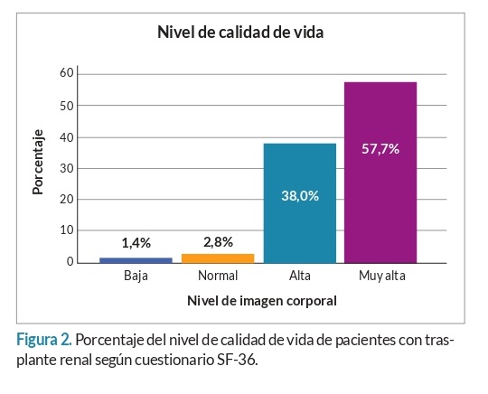 DISCUSIÓN Al analizar los datos generales en el estudio, se observó que la mayor proporción de pacientes con trasplante renal tenía entre los 40 y los 59 años de edad, con una predominancia del sexo masculino. Este hallazgo es consistente con el estudio de Nieto-Ríos18, quien reportó que la edad promedio de los pacientes trasplantados era de 44 años, con una mayor proporción del género masculino (60,7%). Sin embargo, estos resultados difieren de los obtenidos por Gómez-Sánchez et al.19, quienes encontraron que la edad media de los pacientes trasplantados se encontraba entre los 19 y los 65 años, con una media de 35±11,3 años, con un predominio del 65,9% de hombres; lo que podría explicarse por las diferencias en el tamaño muestral y el contexto poblacional que presentó el estudio. En cuanto a las otras covariables sociodemográficas, como estado civil, nivel de estudios y situación laboral, los resultados concuerdan con los hallazgos de Cantillo-Medina20, quien evidenció que la mayoría de los pacientes trasplantados estaban casados, con un nivel educativo predominante en secundaria, y que una proporción significativa no trabajaba, dedicándose mayormente a tareas del hogar. En nuestro estudio, el 47,9% de los trasplantados se encontraba inactivo laboralmente al momento de la encuesta. Este hallazgo es coherente con lo reportado por Julián-Mauro et al.21 en España, quienes identificaron que solo el 27% de los pacientes con terapias de reemplazo renal estaban empleados, mientras que el 46,5% poseía un certificado de incapacidad laboral. Esto se debe a que la enfermedad renal crónica en estadio final y las terapias de reemplazo renal imponen limitaciones funcionales que afectan la capacidad de reinserción laboral22,23. La imagen corporal abarca dimensiones cognitivas, emocionales y conductuales, incluyendo la percepción subjetiva del cuerpo y su influencia en la socialización24. En nuestro estudio, la mayoría de los pacientes trasplantados presentó una insatisfacción moderada con su imagen corporal. Este resultado sugiere que la imagen corporal está directamente relacionada con la calidad de vida, ya que muchos pacientes experimentan dificultades para aceptar el órgano trasplantado, percibiéndolo inicialmente como un elemento ajeno a su cuerpo25,26. Al analizar las dimensiones específicas de la imagen corporal, se encontró que los pacientes manifiestan preocupación por el mantenimiento de la forma física y el cuidado del aspecto físico, mostrando una insatisfacción moderada en ambas dimensiones. Estos resultados son congruentes con los hallazgos de Quezada Andrade et al.27, en México, quienes identificaron que los pacientes jóvenes con insuficiencia renal crónica presentaban alteraciones en su imagen corporal, en el cuidado personal, la pérdida de peso, la coloración de la piel y otros factores asociados a la enfermedad. Asimismo, el estudio de Ramírez et al.28 en Chile destacó que las alteraciones corporales en pacientes con enfermedad renal en diálisis repercuten negativamente en la autoestima y la autoimagen, llevando a muchos pacientes a modificar su vestimenta para ocultar signos visibles de la enfermedad y sus tratamientos. Cuando se analiza la implicancia de la corporeidad en el trasplante renal, es importante señalar el proceso evolutivo que experimenta el receptor frente al donante del riñón. Para fundamentar esta afirmación, podemos citar a Hyman Muslin29, quien describió una de las primeras teorías que define esta apropiación del órgano como gradual. Este procedimiento estaría dividido en tres estadios. En el primer estadio, el órgano es percibido como un cuerpo extraño, separado del cuerpo. En el segundo estadio, los pacientes experimentan el órgano extraño cada vez más como parte de su propio cuerpo; y en el tercer estadio, el órgano trasplantado se integra en la imagen corporal y se percibe como parte del propio cuerpo. Lo encontrado en el presente estudio corrobora el concepto antes planteado, debido a que la mayoría de los pacientes trasplantados manifiesta una moderada insatisfacción en aspectos referidos a la importancia subjetiva de la corporalidad con un 71,8% (n=51). Los resultados globales de este estudio indicaron que el 57,7% de los pacientes percibía una calidad de vida muy alta, mientras que el 38,1% la consideraba alta. Se destacaron las dimensiones de función física, rol físico, dolor corporal y función social, en las que los pacientes obtuvieron los puntajes más elevados. Estos hallazgos son consistentes con los de Montoya-Hincapie30 en Colombia, quien encontró que las dimensiones con mayor impacto fueron el rol físico, la función social y el rol emocional. Además, la relación entre imagen corporal y calidad de vida ha sido documentada en el estudio, de Gargantini y Casari31 en Argentina, quienes analizaron cómo la percepción de la imagen corporal afecta distintos aspectos del bienestar. Sus hallazgos revelaron que las mujeres sometidas a cirugías complejas presentaban insatisfacción en dimensiones como atractivo físico y sexualidad, lo que sugiere que las alteraciones corporales pueden impactar profundamente la percepción del bienestar psicológico y emocional. Según el análisis de correlación entre las dimensiones de la imagen corporal con la CVRS en los pacientes trasplantados del hospital descrito, la percepción cognitiva y emocional (importancia subjetiva y atractivo autoevaluado) tiene mayor impacto en la CVRS. En el estudio, la dimensión rol físico fue la que presentó el porcentaje más alto de pacientes con baja calidad de vida (12,7%), un resultado similar al encontrado por Franco et al32 en Colombia, donde esta dimensión también obtuvo los puntajes más bajos. Esto indica que, aunque los pacientes trasplantados experimentan mejoras generales en su calidad de vida, aún enfrentan limitaciones en su desempeño en actividades cotidianas y laborales. Un estudio real