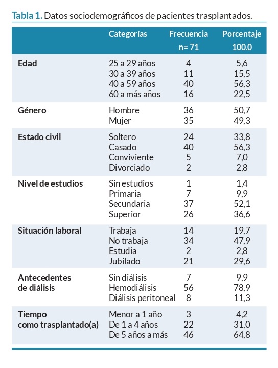 RESULTADOS Un total de 71 pacientes participaron en la investigación, cuyos datos sociodemográficos están representados en la tabla 1. | ||