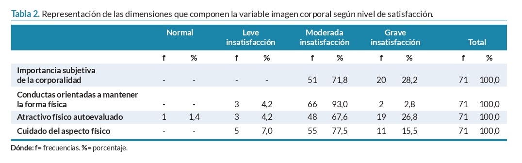 En la tabla 2, se representan las dimensiones de la imagen corporal en los pacientes trasplantados. Se encontró que, el 71,8% (n=51) manifestó insatisfacción moderada en la dimensión importancia subjetiva de la corporalidad. El 93% (n=66) presentó el mismo nivel de insatisfacción en la dimensión conductas orientadas a mantener la forma física. El 67,6% (n=48) manifestó insatisfacción moderada en la dimensión atractivo físico autoevaluado; mientras que el 77,5% (n=55) presentó insatisfacción moderada en la dimensión cuidado del aspecto físico. | ||