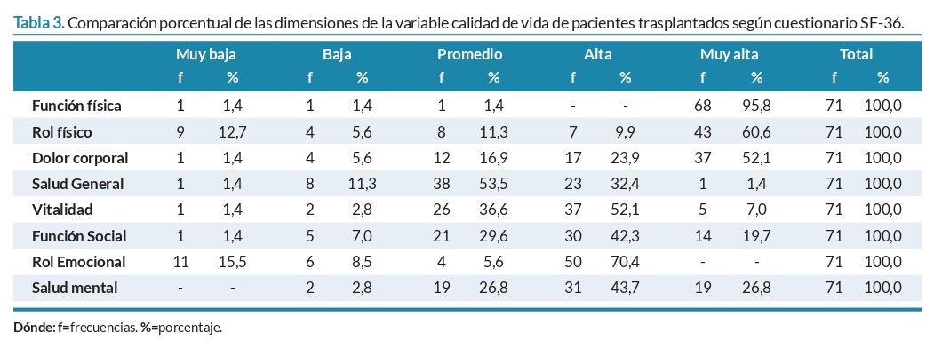 Al comparar las dimensiones de la variable calidad de vida, se evidenció que, en la dimensión de función física, el 95,8% (n=68) presentaba una calidad de vida muy alta. Otro dato relevante de un nivel alto en calidad de vida fue la dimensión rol físico, que alcanzó el 60,6% (n=43). Así mismo, la dimensión de dolor corporal, alcanzó el 52,1% (n=37) en calidad de vida muy alta. El componente de calidad de vida que presentó la mayor puntuación en el nivel alto, fue la dimensión de rol emocional con 70,4% (n=50); mientras tanto, la dimensión salud general destacó en el nivel medio de calidad de vida con 53,5% (n=38). La dimensión rol físico presentó un nivel muy bajo de calidad de vida, que se traduce en un 12,7% (n=9) (tabla 3). | ||