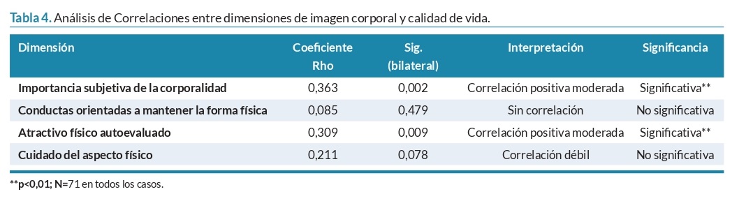 El análisis de correlación entre la imagen corporal y calidad de vida en pacientes con trasplante renal del Hospital Nacional Alberto Sabogal Sologuren mostró que el coeficiente Rho de Spearman fue de -0,375 y p=0,001 (<0,05) lo que indica la existencia de una correlación significativa entre ambas variables. Por otro lado, las correlaciones entre las dimensiones de la variable imagen corporal y calidad de vida, evidenciaron que las dimensiones importancia de la corporalidad (Rho=0,363; p=0,002) y atractivo físico autoevaluado (Rho=0,309; p=0,009) se correlacionan moderadamente con la calidad de vida; mientras las dimensiones conductas orientadas a mantener la forma física (Rho=0,085; p=0,479), y cuidado del aspecto físico (Rho=0,211; p=0,078) reflejan ausencia de correlación con la calidad de vida (tabla 4). | ||