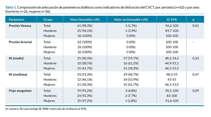 Durante el periodo “antes” (uso del CSCVN), se documentaron 4 episodios de BRC en un total de 6.418 días de catéter, lo que corresponde a una tasa de BRC de 1,25 episodios por cada 1.000 días de catéter. En el periodo “después” (conexión directa), se registraron 2 episodios en 12.970 días de catéter, obteniéndose una tasa de BRC de 0,15 episodios por cada 1.000 días de catéter. La diferencia entre ambos periodos fue estadísticamente significativa (p=0,047). Respecto a los valores técnicos de disfunción del CVCT, tal como muestra la tabla 1, se reveló una diferencia estadísticamente significativa en PV entre sexos, con mayor proporción de cumplimiento en mujeres (p=0,01). No se observaron diferencias significativas por sexo en PA, Qb y Kt, aunque se evidenció una tendencia no significativa a mayor cumplimiento en mujeres. Cabe destacar que, pese a esta tendencia, la media de Kt en litros fue significativamente superior en hombres (p<0,05). El Qb fue adecuado en el 89,1% de los casos. | ||