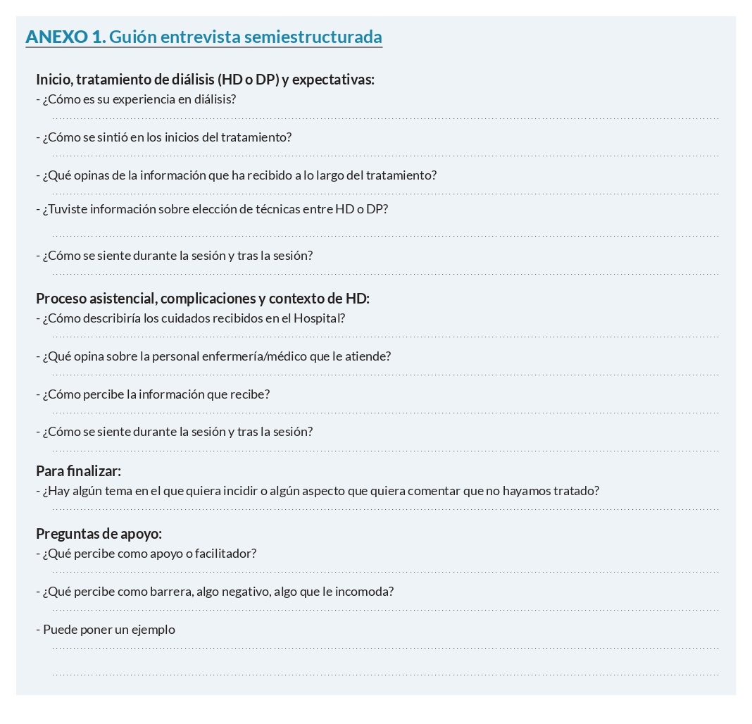 El guion de entrevista incluye las siguientes cuestiones a) Inicio y trascurso del tratamiento de reemplazo renal, b) El contexto del tratamiento c) Transcurso de la ERC y e) Dificultades y expectativas. Para asegurar el rigor del guion de la entrevista es supervisado por dos expertas en investigación cualitativa (M.M.A. y R.B.S.). Véase anexo 1 Guion de la entrevista en anexos. Recopilación y análisis de datos