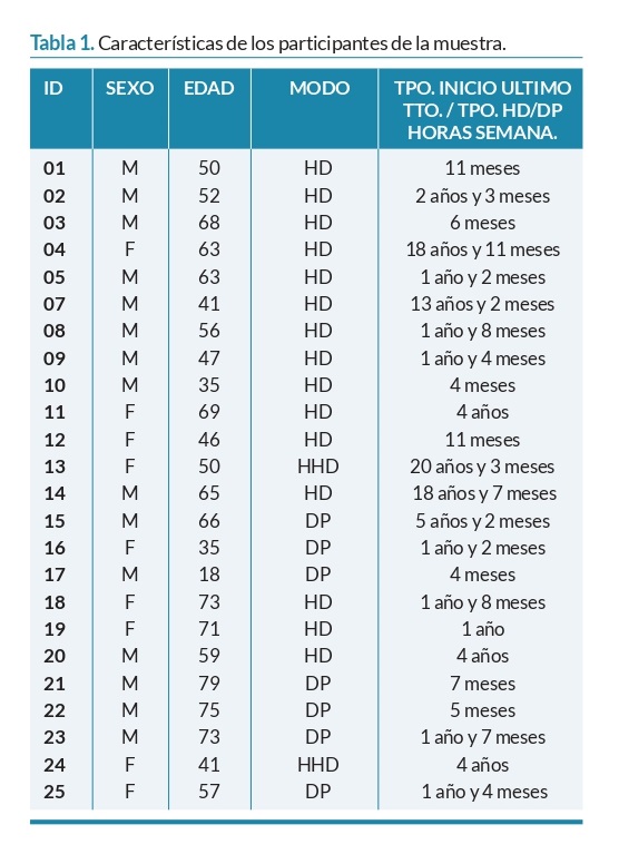 La entrevistadora fue seleccionada por su experiencia en investigación cualitativa y ser ajena a la Unidad de diálisis de los pacientes entrevistados. La revisión y validación del guion de la entrevista por parte del equipo de investigación, es con el objetivo de eliminar sesgos de interpretación. El guion de la entrevista está adaptado a preguntas abiertas para facilitar las respuestas del participante. Para confirmar la fiabilidad del guion de entrevistas, se realiza previo al estudio un pilotaje. Tras cada entrevista, se utilizó el método de comparación constante para comentar los aspectos principales del tipo de respuesta de los principales temas mediante consenso entre I.M.C. y M.E.L. En paralelo a las entrevistas, M.E.L trascribe las entrevistas. De septiembre a octubre de 2023 a los participantes se les entregó un informe de resultados preliminares de los grandes temas relevantes. Algunos participantes confirman la identificación de temas lo que justifica el razonamiento del equipo investigador. RESULTADOS Se informó a un total de 28 pacientes en HD y 11 en DP, de los que finalmente fueron entrevistadas 24 personas, nueve mujeres (37,5%) y quince hombres (62,5%). Diecisiete con tratamiento de HD (70,8%) y dos de ellas con hemodiálisis domiciliaria. Por otro lado, siete personas reciben tratamiento de DP (29,2%). Véase tabla 1. | ||