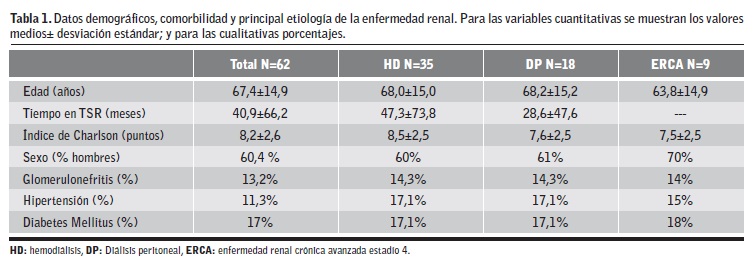 La primera parte del programa de ejercicio consistió en un breve calentamiento, indicando al paciente que después de tomarse la tensión arterial y el pulso, deambulara un mínimo de 3 minutos. Finalizado este tiempo empezaban los ejercicios de musculación. Las series y repeticiones eran adaptadas a las capacidades de cada sujeto, el estándar era empezar por una serie de 10 repeticiones e ir progresando en número de series y repeticiones. Sin embargo, pacientes con una disminución muy elevada de su condición física podían empezar con una serie de 3 repeticiones. Se les indicaba también que entre series debían descansar 1 minuto, entre ejercicios, caminar otro minuto y un segundo entre repeticiones. En los ejercicios se potenciaban fundamentalmente los cuádriceps en sedestación y bipedestación, los isquiotibiales, el glúteo medio, tríceps sural, y se entrenaba el equilibrio. Para poder controlar la evolución del participante o solventar cualquier duda o problema, los participantes disponían de un teléfono directo con el investigador principal (enfermera) de lunes a viernes de 8 a 17h. Y el investigador principal realizaba una llamada semanal para resumir el trabajo realizado, conocer las sensaciones del sujeto, y aumentar, disminuir o mantener cargas de trabajo. Análisis estadístico El análisis estadístico se realizó con el programa SPSS versión 19.0 (SpSS Inc, Chicago, IL, EE.UU.) las variables cuantitativas se expresaron mediante la media y la desviación estándar. Las variables cualitativas, mediante porcentaje. La comparación de los datos cuantitativos del mismo grupo se realizó mediante la prueba de Wilcoxon para variables relacionadas no paramétricas, considerando significación estadística aquellas relaciones con un valor de p=0,05. Consideraciones éticas El estudio fue aprobado por el Comité Ético de Investigación Clínica del Hospital de Terrassa (CI:02-17-108038) y realizado de acuerdo con las indicaciones y los requerimientos expresados en las normas internacionales relativas a la realización de estudios de la Declaración de Helsinki (revisión de Seúl, octubre 2008). Resultados Se valoró la inclusión potencial de 117 pacientes (60 HD, 32 DP, 25 ERCA). De ellos, 62 pacientes (35 HD, 18 DP, 9 ERCA) superaron los criterios establecidos y fueron incluidos en el estudio (Figura 1): 39 hombres y 23 mujeres con una edad media 67,4±14,9 años. A las 12 semanas finalizaron el programa 53 pacientes (29 HD, 17 DP, 7 ERCA). | |