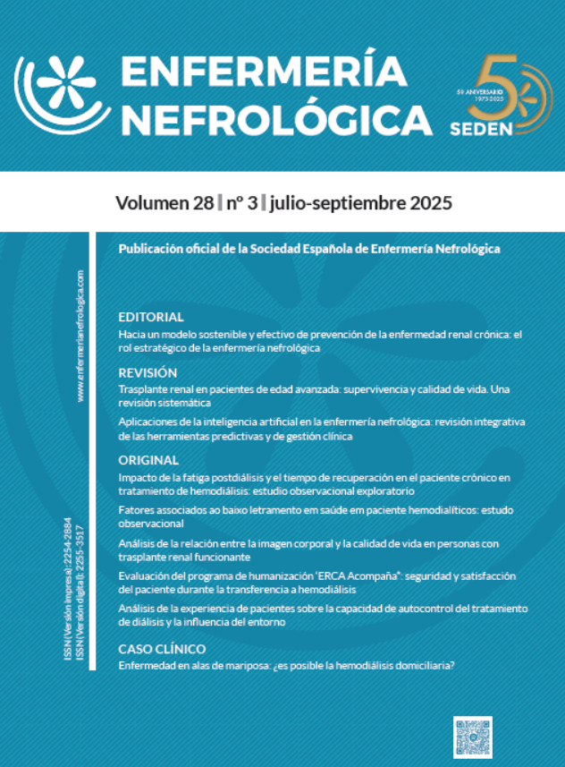 Jiménez Mayor E, González Sanchidrián S, Guerra Maestre MJ. Enfermedad en alas de mariposa: ¿es posible la hemodiálisis domiciliaria?. Enferm Nefrol [Internet]. 2025 [consultado 1 Oct 2025];28(3):[aprox. 7 p.]. Disponible en: https://www.enfermerianefrologica.com/revista/article/view/4855